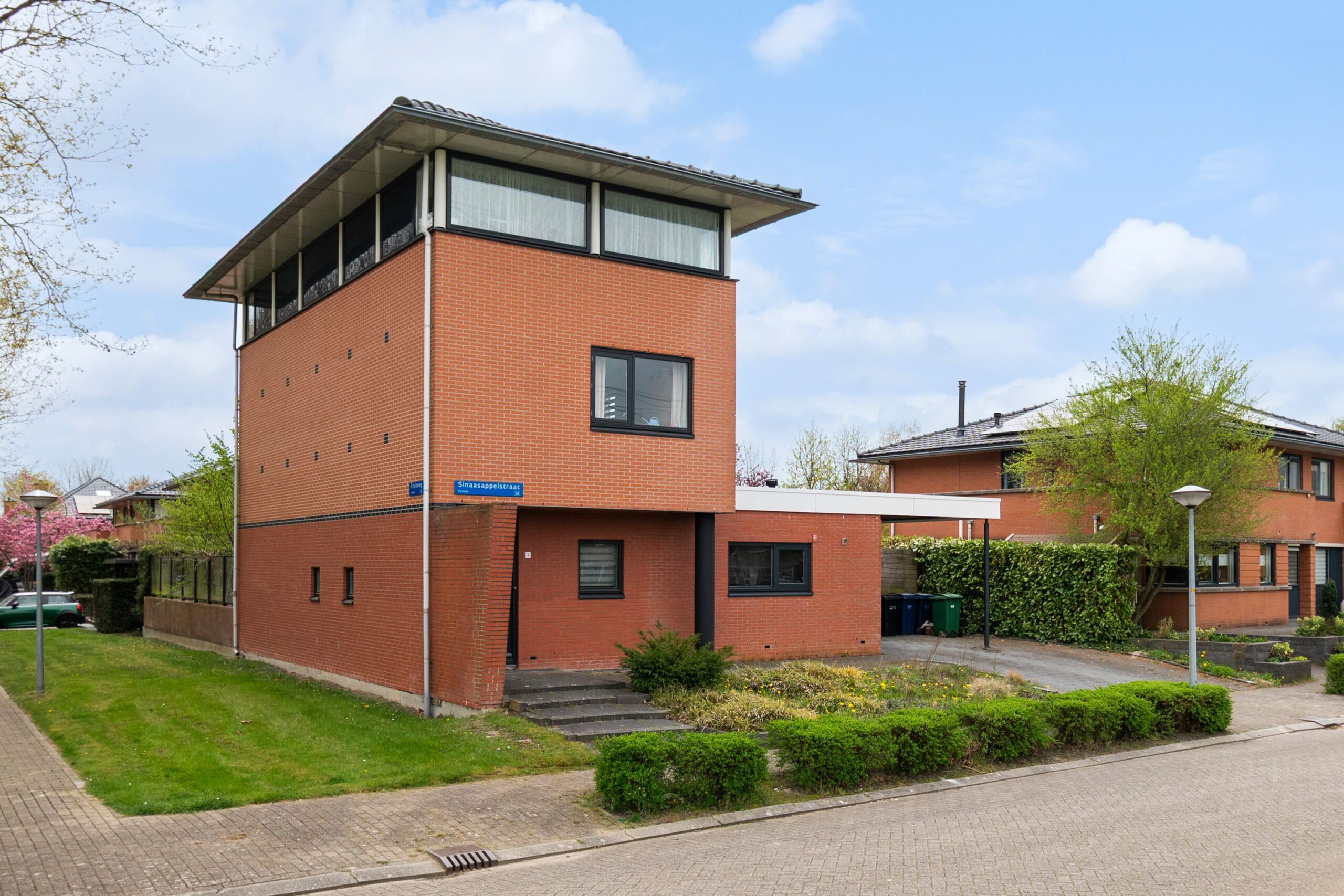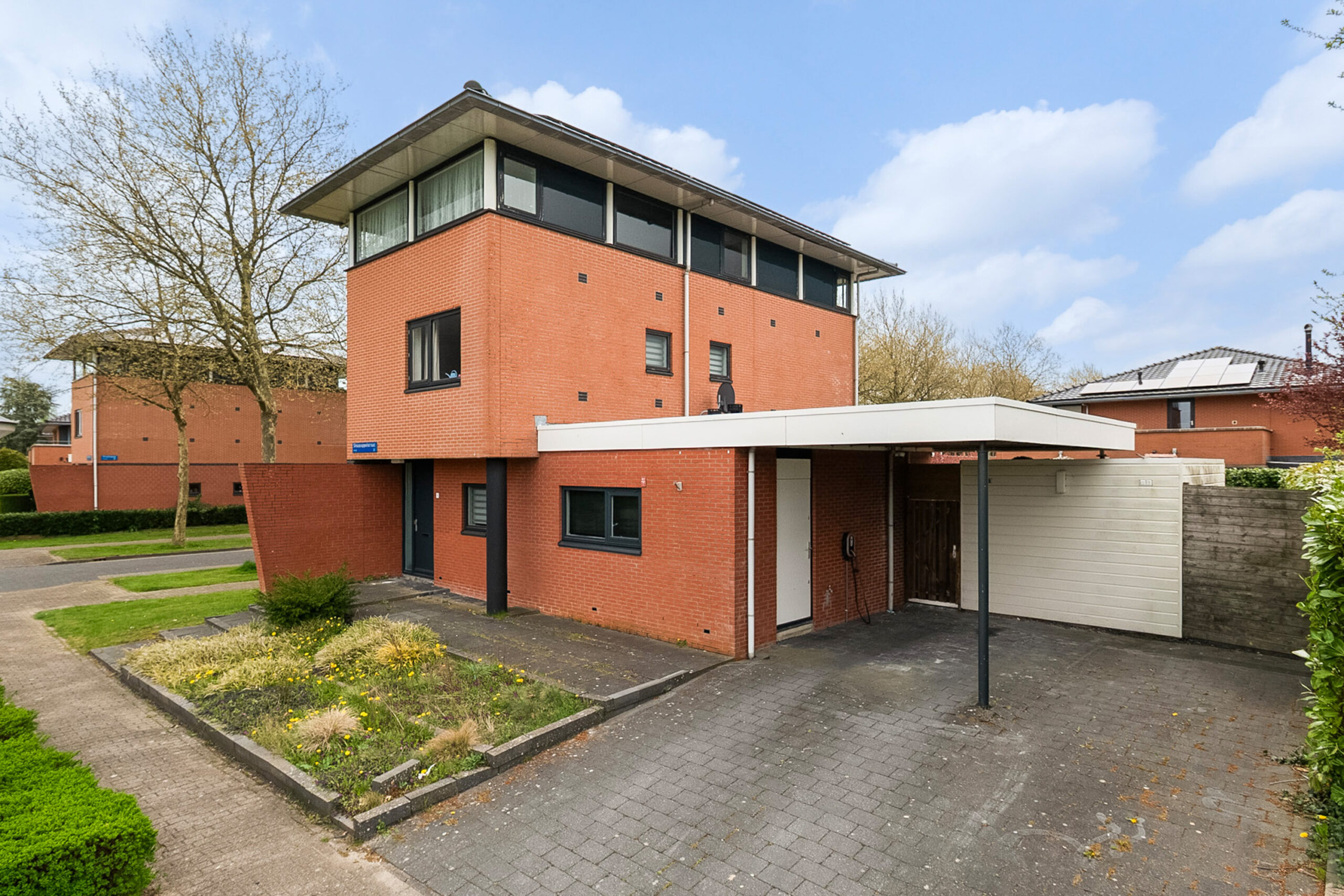 De oprit met een gedeeltelijke carport aan de voorzijde bied plaats aan 2 auto’s.
