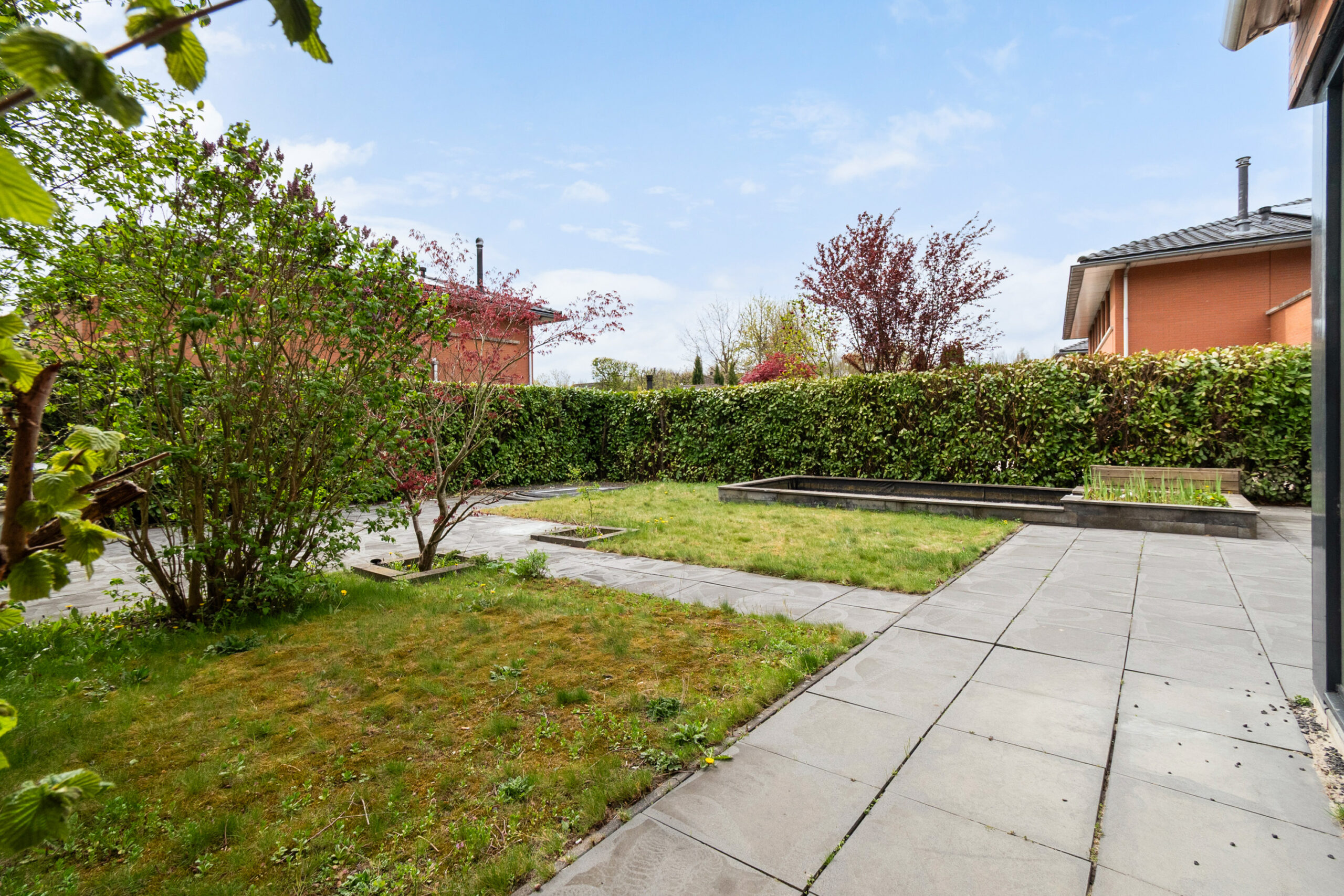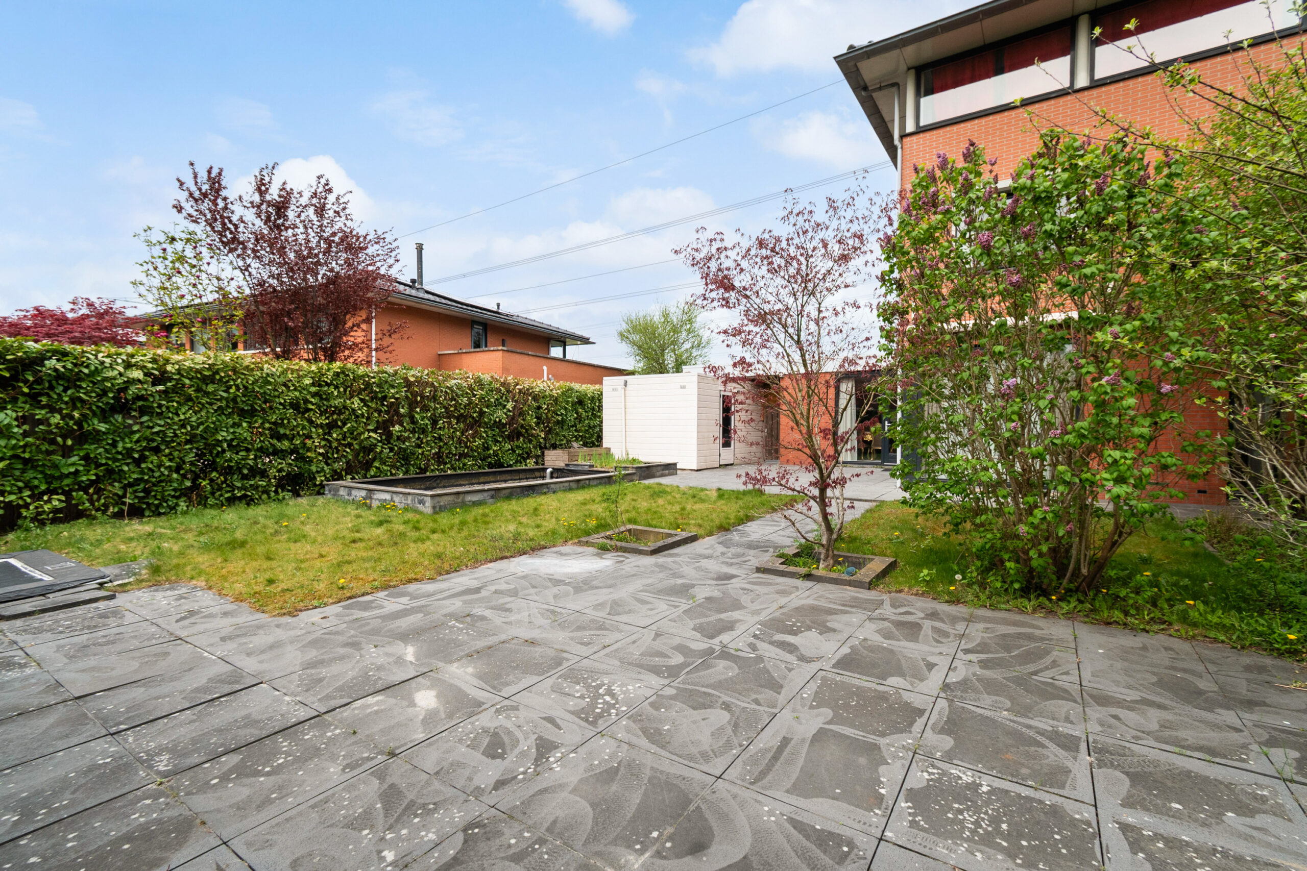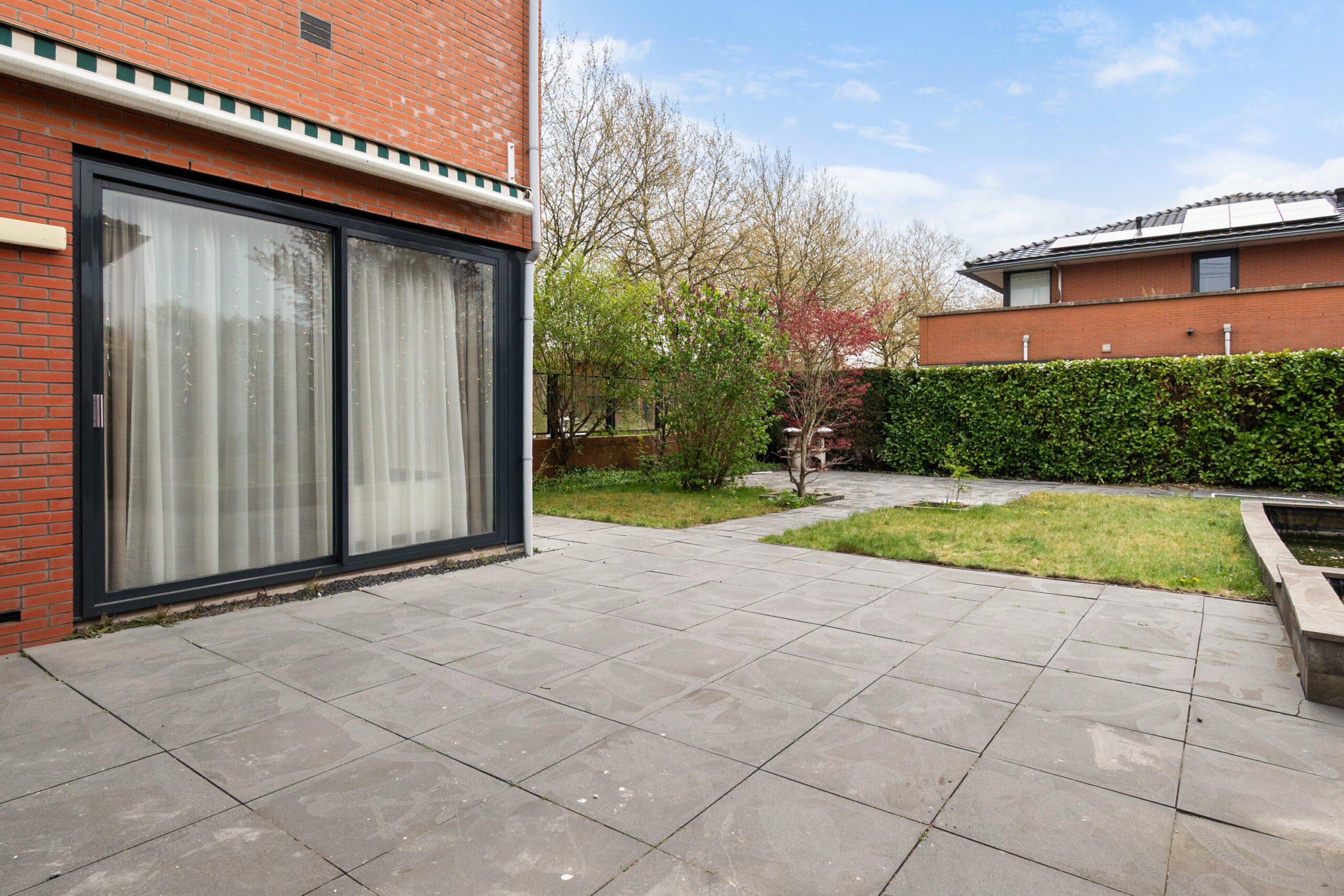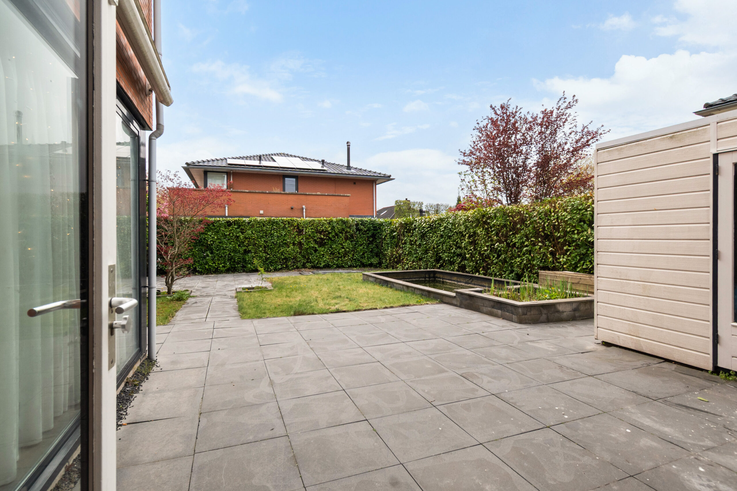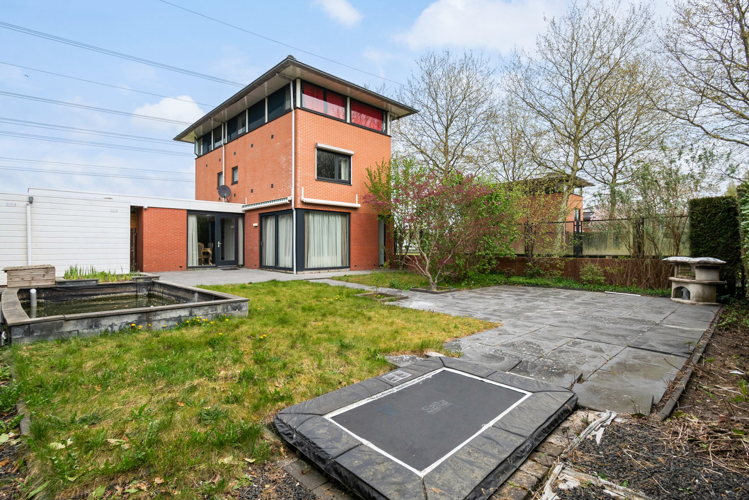 Ruime zonnige achtertuin met twee terrassen, gazon, borders, een trampoline en een vijver. De tuin biedt veel privacy en u kunt genieten van de zon op diverse plekken in de tuin. Semi-automatisch zonnescherm bij de schuifpui en een zonnescherm met handmatig draaimechanisme bij het achterraam. Vrijstaande berging bekleed met kunststof.
